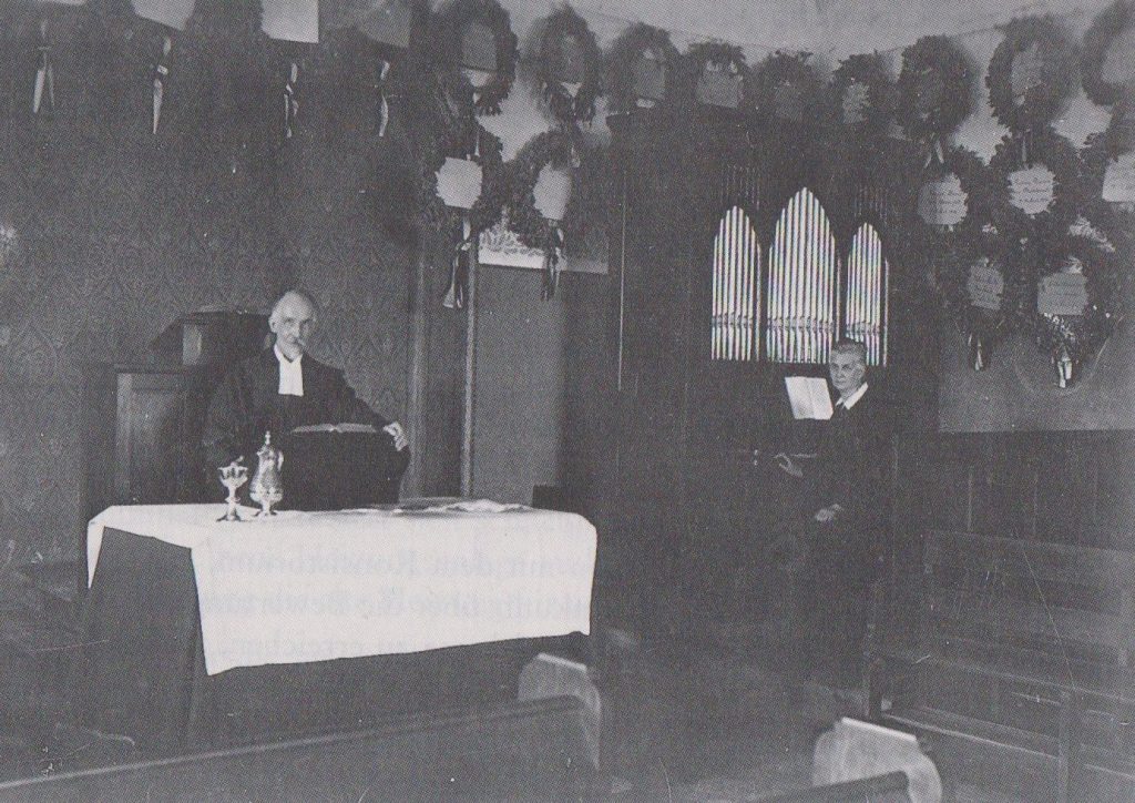 (Pastor Menges hinter dem Abendmahlstisch, an der Orgel seine Frau)