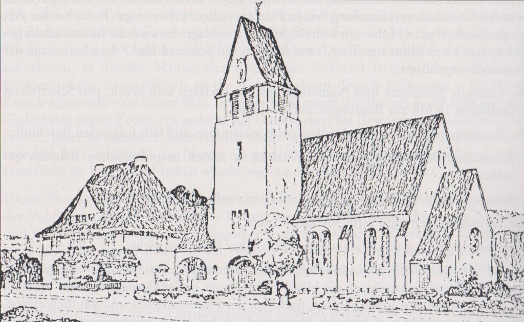 Die eigentliche Kirche mit dem Turm sollte neben dem Gemeindesaal errichtet werden. Darum baute man das Gemeindehaus zunächst ohne Turm. In den Notzeiten, die dem Kriege folgten, konnte der Plan aber nicht eingehalten werden. Der ursprünglich als behelfsmäßig gedachte Zustand, nämlich die Gottesdienste im Gemeindesaal abzuhalten, wurde von der Gemeinde allmählich als normal empfunden. Das einzige, was man noch entbehrte, war ein Kirchturm. Unter der Leitung von Pastor Herbrechtsmeier konnte dieses Vorhaben im Jahre 1935 durchgeführt werden. Außerdem wurde der Gemeindesaal um die Breite des Turms erweitert, so dass weitere Sitzplätze gewonnen waren . Auf diese Weise entstand der jetzige Kirchenraum, der immer den Charakter eines größeren Gemeindesaales beibehalten hat. Manche Gemeindemitglieder sagen auch, es sei das „Wohnzimmer“ der Kirchengemeinde.