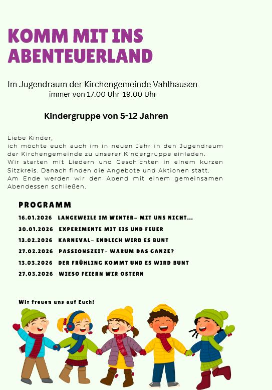 Zunächst starten wir in der Gesamtgruppe um 17.00 Uhr, jeweils mit einer kleinen Geschichte, einem Lied oder Ähnlichem. Danach teilt sich die Gruppe auf, damit altersgerecht an dem jeweiligen Programm gearbeitet, gebastelt, gespielt werden kann. Alle Räumlichkeiten der Kirche, sowie das große Außengelände werden dazu genutzt. Natürlich gibt es auch Ausflüge, etwa zum Minigolf.